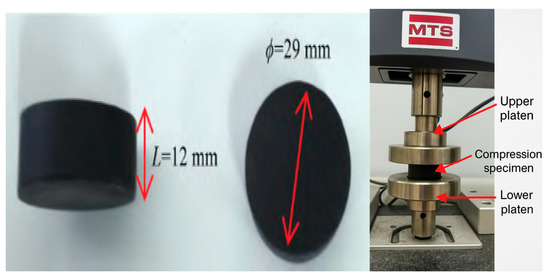 To ensure the accuracy of the model parameters, in this study, a natural rubber compression sample with a Shore hardness of 77 is used as an example, with the true stress–strain data of the sample obtained through uniaxial compression tests. Data fitting for the constitutive model is carried out using ANSYS 2022 simulation software. These parameters not only accurately reflect the mechanical properties of the rubber material under large strain conditions but also provide a solid foundation for subsequent simulation calculations, which helps improve the predictive accuracy of the model and enhances its reliability in practical engineering applications. The rubber specimen, experimental equipment, and rubber model parameters are detailed below, as shown in Figure 13 and Table 3.