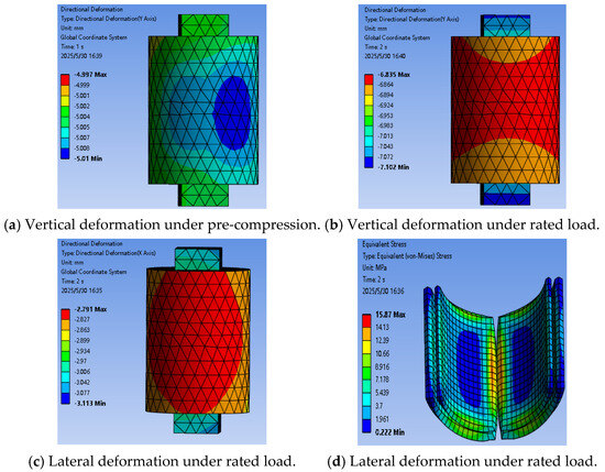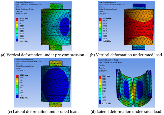 Figure 14 presents the finite element simulation results of the gearbox elastic support under different working conditions, allowing for an evaluation of its stiffness performance and the equivalent stress distribution of the rubber components. Figure 14a illustrates the vertical deformation of the torque arm under pre-compression conditions, Figure 14b and Figure 14c show the deformation of the torque arm in the vertical and horizontal directions, respectively, under a rated load of 1650 kN, and Figure 14d presents the equivalent stress contour of the rubber component under the same load. In the simulation, the average vertical deformation of the torque arm of the elastic support under a rated load is used as the displacement to evaluate the vertical stiffness of the elastic support, while the average horizontal deformation of the torque arm under a rated load is used to evaluate the horizontal stiffness. According to the stiffness calculation formula, the vertical static stiffness obtained from the simulation is 816.83 kN/mm, with an error of 8.5% compared to the physical experimental results; the horizontal static stiffness is 546.35 kN/mm, with an error of 8.7%. The discrepancies between the finite element analysis outcomes and the empirical experimental data are below 10%, effectively confirming the simulation’s reliability.