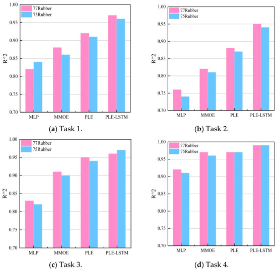 The MLP, PLE, MMOE, and PLE-LSTM network frameworks are used to train the data. The mean square error (MSE) is used as a loss function for each task. After training, the determination coefficients (R2) obtained for the four models on the verification set are shown in Table 6.