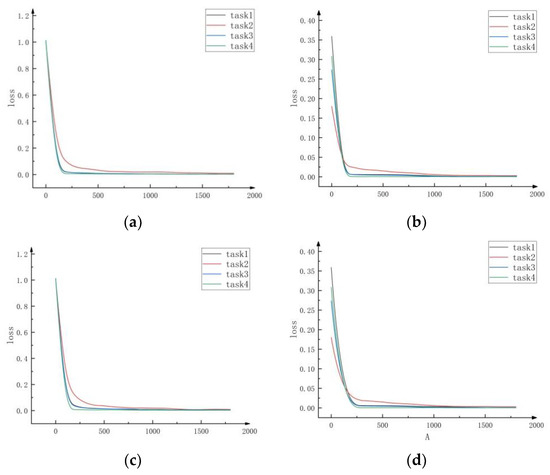 Multi-task loss values as a function of iteration steps. (a) PLE-LSTM on data set 1. (b) PLE-LSTM (improved loss function) on data set 1. (c) PLE-LSTM on data set 2. (d) PLE-LSTM (improved loss function) on data set 2.