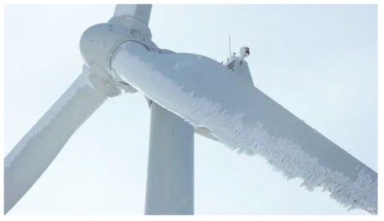 As a clean and efficient renewable energy source, wind energy continues to account for an increasing share in the global energy mix [1,2]. Due to the superior wind speed conditions in mountain, ridge, and high-altitude areas, the site selection of wind farms is often concentrated in these areas [3,4]. However, due to the influence of micro-topography and meteorological conditions, especially in winter, extreme weather phenomena such as frost, rime, and cold wave occur frequently, resulting in increasingly serious wind turbine blade icing problems [5,6,7,8,9], as shown in Figure 1. Ice adhesion not only changes the geometric profile of the blade, leading to deterioration of aerodynamic performance and reduction of output power [10], but also may lead to structural imbalance and safety risks [11,12,13].