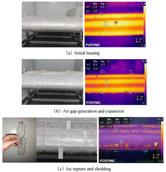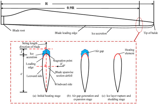 The deicing process of wind turbine blades by electric heating is mainly divided into three stages: initial heating stage, air gap generation, and expansion stage, and ice rupture and shedding stage, as shown in Figure 3. The heat transfer process is essentially a complex thermophysical process involving air flow, heat conduction, phase change heat transfer, and other energy exchange mechanisms.