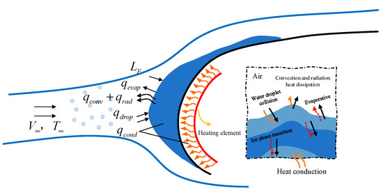 According to the heat transfer path analysis, the main destination of the heat provided by the heating element is: Heat conduction () in the blade, inside the ice sheet and air gap, heat flow terms such as forced convection and radiation between the ice sheet surface and air (, ), heat flow terms of supercooled water droplets () captured on the outer surface of the ice sheet (including the total heat of water droplet collision, warming, freezing, and other processes), heat flow terms absorbed by the latent heat of the ice sheet phase transition. According to the principle of conservation of energy, the heat balance equation of electric heating deicing process can be obtained as follows: