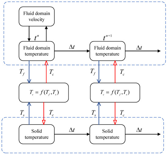 In order to ensure the continuous heat flow on the fluid–structure coupling interface, the temperature field in the solid domain should be coupled with the velocity field and temperature field in the fluid domain at the same time. The solution idea of the coupling calculation method proposed in this paper is shown in Figure 5 and its specific steps are as follows:
