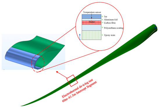 Taking the tip section of a Sinoma87.5 as the research object, a geometric model of an electric heating deicing system with a multi-layer structure was constructed according to the actual ice-coating morphology. As shown in Figure 6, the model consists of leaf material, heat insulation layer, heating layer, thermal conductivity layer, and ice layer from inside to outside. The heating layer is laid by carbon fiber cloth, and by applying voltage to both ends, heat is generated to achieve the function of deicing. Based on the aforementioned numerical theory, this study uses Comsol Multiphysics as the simulation platform, with the Heat Transfer module and CFD module, to perform numerical simulations of the electric heating deicing process.