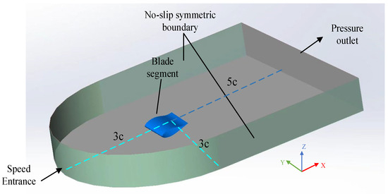 In order to ensure that the numerical results are not disturbed by the boundary, it is necessary to set the calculation range reasonably. In this paper, a three-dimensional computing domain combining cuboid and semi-cylinder is adopted, as shown in Figure 7. Taking the leading edge stationary point of the blade as the coordinate origin, the chord length is defined as c, the dimensions of the blade segment from the entrance and exit in the X direction are 3c and 5c, the dimensions from the symmetric wall surfaces on both sides in the Y direction are 3c, and the height direction of Z is 5c, ensuring that all the characteristics of the flow field and temperature field around the blade are covered.