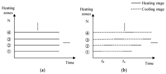 Comparison of two heating modes: (a) continuous heating mode and (b) cyclic heating mode. Where, is the heating time of a single cycle; is the cooling time, which refers to the time when the power supply to a specific region is turned off; ① to ④ represent the heating zones.