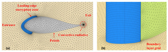 Model mesh is divided into near-field views. (a) Computational domain tangential interface mesh and (b) ice-covered blade surface grid.
