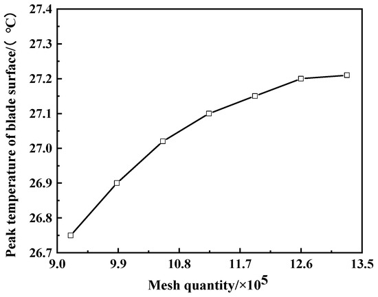In order to balance the convergence of the numerical model and the efficient use of computational resources, a mesh independence study was conducted for the computational domain. As shown in Figure 10, when the mesh quantity reaches 1.26 million, the variation in the peak surface temperature of the blade stabilizes. Therefore, 1.26 million mesh points will be adopted as the mesh division scheme for the subsequent numerical studies.