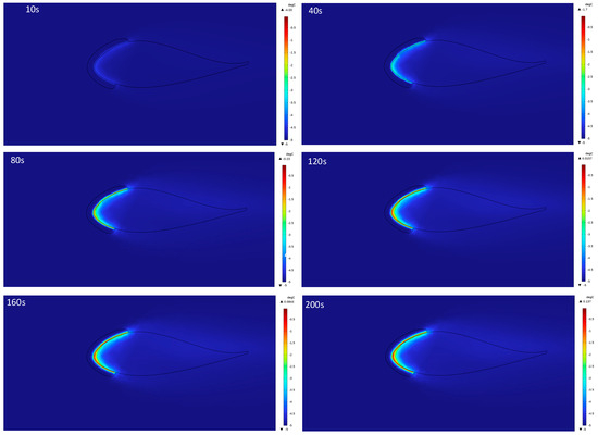 The temperature field evolution of blade surface, ice sheet, and surrounding environment is the key to reveal the coupling mechanism of flow and heat transfer in the process of blade electric heating deicing. Taking continuous heating mode as an example, the simulation of its temperature field distribution over time is shown in Figure 11. In order to clearly show the details of temperature change, the spanwise cross-section of the blade sample was selected for analysis, and the temperature distribution legend of the same level was uniformly used for comparison.
