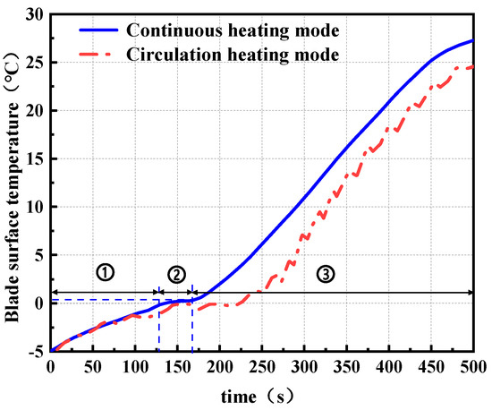 Figure 12 shows the variation of blade surface temperature over time under different heating modes. ① to ③ represent the three stages of the heating de-icing process, including the initial heating period, lag period, and heating-up period. After the system is activated, the surface temperature of the blade gradually increases in both heating modes. However, the continuous heating mode exhibits a faster rate of temperature rise, while the cyclic heating mode displays a periodic fluctuation pattern—temperature increases during the heating phase and decreases slightly during the non-heating phase. When the heating time reaches approximately 128 s and 163 s for the continuous and cyclic modes, respectively, both modes experience a short plateau phase. This stagnation is caused by the absorption of a large amount of latent heat during the ice phase transition, with the plateau lasting longer in the cyclic heating mode. Subsequently, due to the formation of air gaps at the blade–ice interface, local convective heat transfer is enhanced, resulting in a more rapid temperature increase. The blade surface temperature eventually stabilizes at around 27 °C and 23 °C for the continuous and cyclic heating modes, respectively. This saturation phenomenon indicates that the system has reached a state of dynamic thermal equilibrium.