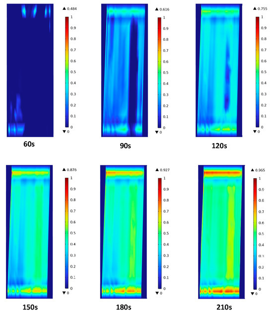 The phase transition behavior of the ice sheet was simulated by using the enthalpy-porosity method, and the evolution characteristics of the liquid phase fraction in the melting region over time were tracked and analyzed. The phase transition process of the inner surface of the ice sheet was obtained, as shown in Figure 13. When the heating time continued until 60 s, the local area of the inner surface of the ice sheet first reached 0 °C and began to undergo a solid–liquid phase change, forming a small amount of liquid water and gradually expanding to the surrounding area. With the advance of heating time, most areas of the ice layer have reached the phase transition point, the phase transition process is significantly intensified, and the liquid volume fraction increases rapidly. Finally, the phase transition process tends to the saturation state, which may be caused by the change of the heat transfer mechanism on the blade surface due to the increase in space clearance, which reduces the heat transfer efficiency. This phenomenon is precisely explained by the continuous increase in blade surface temperature.
