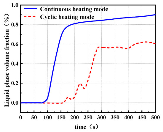 Figure 14 further compares the liquid water volume fraction under the two heating modes. The continuous heating mode achieves ice melting more rapidly, with the liquid phase volume fraction increasing sharply to approximately 80% during the 100–150 s interval and gradually approaching saturation thereafter. In contrast, under the cyclic heating mode, the liquid water fraction begins to increase significantly around 165 s. Due to intermittent heating, a noticeable decrease of about 10% is observed during the non-heating phases, which may be attributed to secondary freezing of the meltwater during the cooling periods. However, as latent heat is progressively absorbed during the phase transition, the melting process becomes more uniform and the magnitude of this back-freezing effect gradually diminishes.