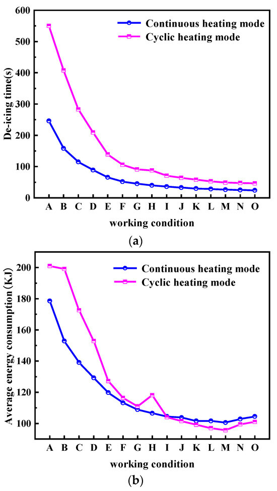 As shown in Figure 15b, the average energy consumption of the two heating deicing modes decreases with the increase in heating power. In fact, the energy consumption of the cyclic heating mode is generally higher than that of the continuous heating mode, especially in the low-power condition. At medium and high power, the energy utilization of circulating heating shows an optimization trend, the difference of energy consumption decreases, and the working condition M is the best advantage. Under ultra-high-power conditions (N, O), the energy consumption rises slightly, which may be due to the increase in temperature difference leading to the increase in convection and radiant heat loss.
