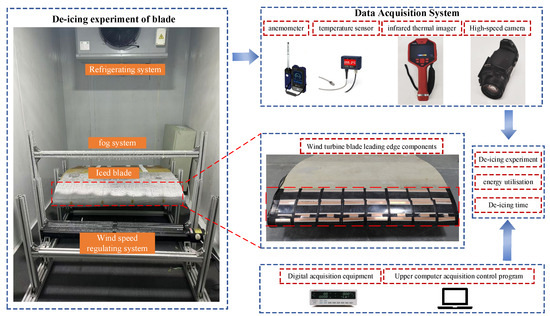 In order to be as close as possible to the actual operating conditions of wind turbine blades in the freezing environment, the electric deicing experiment was carried out in the self-built artificial low-temperature ice-covering laboratory. The laboratory, 6 m long, 3 m wide, and 3.2 m high, is suitable for ice-coating experiments of small components of wind power blades, as shown in Figure 16. The 1.5 m tip section of a Sinoma87.5 blade was selected as the experimental object. The experimental system mainly consisted of a refrigeration system, spray system, wind speed regulation system, and icing blade, which could provide a stable and controllable experimental environment for icing and deicing. The electric heating element uses flexible carbon crystal heating films, which are laid on each sub-heating region of the blade sample’s leading edge. The heating mode is controlled by switching the relays on and off to regulate the heating and cooling times.