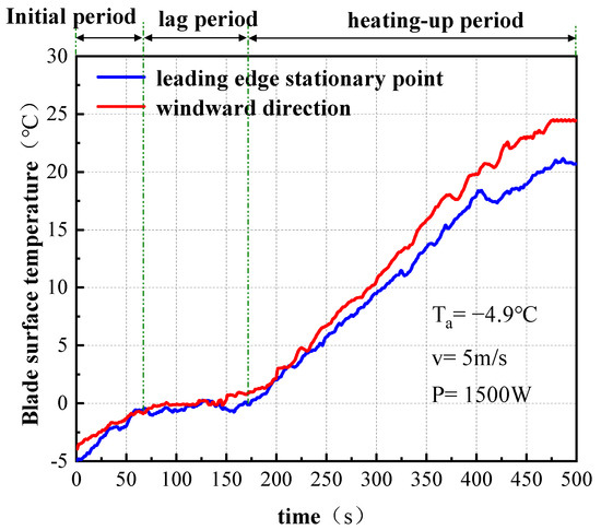 This experiment analyzed the dynamic development process of blade surface temperature under different heating modes by monitoring the temperature sensor attached to the blade surface. Figure 18 and Figure 19, respectively, show blade surface temperature changes at different chord lengths (including leading edge stagnation point and windward side) under two heating modes.