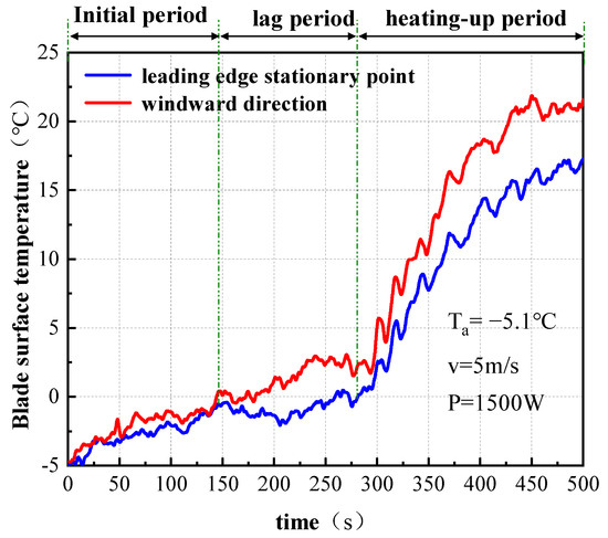 During the initial heating phase, compared to the continuous heating mode, the cyclic heating mode has a slower initial heating rate and takes a longer time. In the stagnation phase, the temperature change is relatively stable. The time periods experienced during this phase are 110~145 s for continuous heating and 155~228 s for cyclic heating. After entering the rapid heating phase, the temperature increases rapidly. The peak temperature at the leading edge for the continuous heating mode reaches 24.2 °C, while for the cyclic heating mode, the peak temperature is only 19.1 °C. Additionally, due to the influence of wind speed, the temperature change at the leading edge lags behind that at the windward side. By comparing the experimental results with the numerical simulation results, it is found that the temperature change trends are generally consistent, thereby verifying the reliability of the numerical model. It should be noted that during the experiment, the ambient temperature Ta was always maintained at about 5 °C and the ambient wind velocity Va was maintained at 5 m/s.