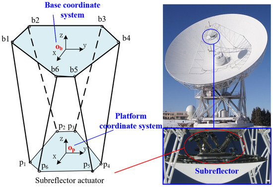 To achieve the necessary precision, modern radio telescopes often utilize 6-Degree Of Freedom (6-DOF) parallel platforms as subreflector actuators to adjust the subreflector’s position and orientation [3]. The QiTai Radio Telescope (QTT), currently under construction, features a Gregorian parabolic antenna designed to cover the frequency range of 150 MHz to 115 GHz, a subreflector that is an aluminum honeycomb sandwich structure, an aperture of 12 m, and a weight of about 4000 kg, and its geometric surface is a hyperboloid of revolution [4,5]. The subreflector of QTT employs an asymmetric Stewart platform to achieve the desired position and orientation through precise control of each actuator’s length [6]. The Green Bank Radio Telescope (GBT) also uses an orthogonal Stewart platform as a subreflector actuator [7]. Additionally, in 2006, the 100 m Effelsberg telescope was upgraded with an active subreflector system that implemented an asymmetric Stewart platform to ensure the accurate positioning and orientation of the subreflector [8]. Several well-known radio telescopes have successfully applied traditional Stewart platforms, including the Large Millimeter Telescope (LMT) [9], the Atacama Large Millimeter Array (ALMA) [10], the Five-hundred-meter Aperture Spherical Telescope (FAST) [11], the TianMa Radio Telescope [12], and the NanShan Radio Telescope (NSRT) [13], among others.