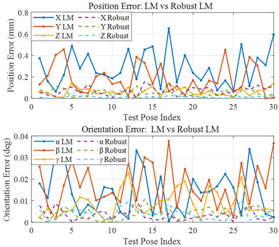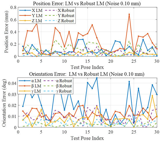 As shown in Figure 3, as noise levels increase to , the error gap between the two methods becomes even more evident. The position error for the traditional LM grows significantly to 0.3835 mm, while the robust LM maintains a much lower error of 0.0973 mm, reflecting a 74.6% reduction. Similarly, the orientation error is reduced from 0.0273° to 0.0076°, an improvement of 72.2%. These results highlight the noise suppression capability of the robust algorithm, particularly through the influence-limiting behavior of the Huber loss.