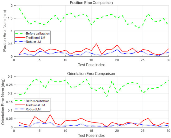 Prior to calibration, the mean position error was 1.4626 mm. After applying the robust LM algorithm, this was reduced to 0.1182 mm, representing a 91.9% improvement. In comparison, the traditional LM approach achieved a higher mean error of 0.2327 mm, nearly twice that of the robust method. The maximum position error decreased from 1.8804 mm to 0.2690 mm using robust LM, whereas traditional LM reduced it to 0.5024 mm.