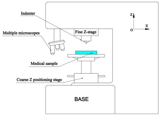 Compliant mechanisms utilize monolithic structures, eliminating backlash, friction, and the need for assembly, lubrication, and maintenance, while offering lightweight, compact sizes and lower costs [,]. Therefore, compliant mechanisms have been widely utilized in various fields, including constant-torque mechanisms [], bistable mechanisms [,], assisted-vibration machining [,,], micro grippers [,,], harvesters for energy [], robotics [], and precise positioning [,,]. Compliant mechanisms have been primarily utilized in precise positioning devices due to their high resolution, precisely repeatable motion, low friction, and compact size []. Therefore, based on the advantages of compliant mechanisms, they have been potentially utilized in compliant positioners for precise positioning systems as well as nanoindentation locating systems to locate the sample position for assessing the mechanical properties of biological specimens. Currently, nanoindentation instruments exploit traditional instruments for real-time detection and observation of the mechanical characteristics of the specimen [,]. Therefore, a compact design is a potential application for an in situ nanoindentation checking system, aiming to reduce energy consumption and minimize working space. To locate accurately, in situ nanoindentation instruments frequently demand numerous force-displacement feedback sensors. In situ nanoindentation utilizes a fine Z-positioner to guide the indenter and a fine XY-positioner to locate the biological specimen accurately. However, the current positioners have a slow response and a low resonance frequency. Their size makes it challenging to integrate in situ nanoindentation with multi-microscopes into a scanning electron microscope (SEM). Therefore, an innovative compliant compact positioner with a rapid response and a suitable working stroke is essential for guiding the indenter integrated into the nanoindentation testing positioning system.
