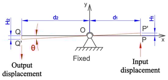 In this research, the hybrid displacement amplifier, which combines the eight-lever symmetric mechanism and the Scott Russell mechanism, was integrated into the proposed positioner to enhance the operating travel of the guiding mechanism during the nanoindentation-assessing process. More specifically, the operating principle of a lever structure is illustrated in Figure 2. The input displacement (H1) is applied at point P, and P′ is achieved H1 from P in the Y-direction. Meanwhile, point Q′ achieved H2 from Q in the Y-direction, as well as the lever rotating around the point O an angle ϴ. Parameters d1 and d2 are dimensions of the PQ lever lengths revolving an O center.