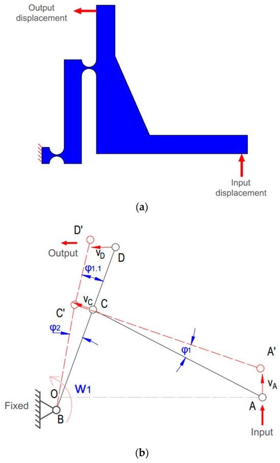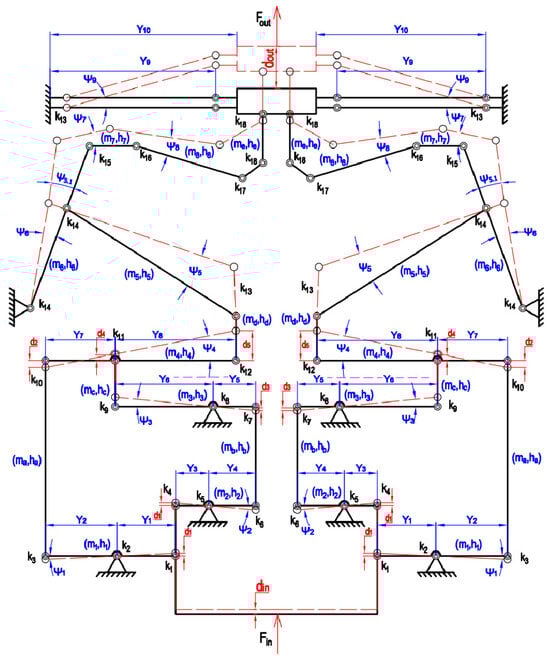 As demonstrated in Figure 10 and Figure 11, a chain of analytical equations for calculating the displacement amplification ratio is the following Equations (3)–(15):