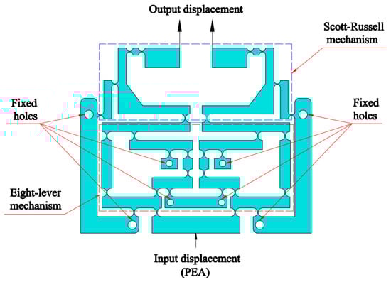 In addition, to enhance output displacement, a new symmetric hybrid displacement amplifier utilizing an eight-lever mechanism and a Scott Russell mechanism was developed to integrate into the proposed positioner, as shown in Figure 4.