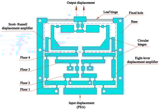 In addition, the hybrid amplifier connected with symmetric-parallel leading structure integrated into four rectangular joints to reduce the parasitic motion error as well as keep high output displacement, as demonstrated in Figure 5. More specifically, as depicted in Figure 5, the symmetric four-lever displacement amplifier had symmetric four-floors to reduce a decoupling motion error and ensure a high displacement amplification ratio. Therefore, controlling the number of floors in the multi-lever amplifier-integrated Scott Russell mechanism will provide a high intensification proportion, allowing for efficient observation of the indentation testing procedure. The input displacement is operated by a piezoelectric actuator (PEA). The 3D design model of the advanced Z-stage is revealed in Figure 6.
