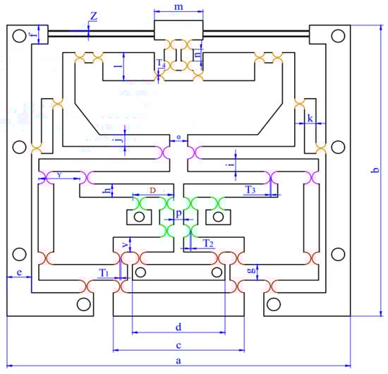 The developed positioner was fabricated from material Al-7075 due to its favourable characteristics, including a high yield strength of 503 MPa, an elastic modulus of 71.7 GPa, and a 2810 kg/m³ density. As illustrated in Figure 7, the total dimensions of the proposed positioner are 210 mm × 186 mm × 10 mm. The positioner included the following parts: (i) a PEA actuator, (ii) a hybrid symmetric displacement amplifier of an eight-lever mechanism and Scott Russell mechanism integrated right circular joints, (iii) a parallel guiding mechanism integrated rectangular joints, and (iv) fixed holes. More specifically, the right circular hinges were selected for the proposed positioner to achieve the desired controlling position accuracy due to their excellent characteristic of high rotary center accuracy []. The dimensional schema in Figure 7 illustrates the main dimensional parameters of the proposed positioner, which are used to build an initial design. Additionally, the main dimension values of the proposed positioner are presented in Table 1. More specifically, T1, T2, T3, and T4 are right circular hinge thicknesses on different floors of the proposed stage with various colors and different values for ensuring the energy transferring efficiency in the diagram, as illustrated in Figure 7. Moreover, D and Y are the lever distances in a lever amplification mechanism.