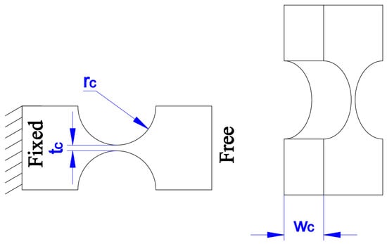 In this research, right circular hinges and rectangular hinges were proposed to integrate into the proposed positioner. More specifically, the right circular hinges were utilized in the hybrid displacement amplifier to achieve a high working stroke and high control motion accuracy. Additionally, rectangular hinges were used for the parallel guiding mechanism to achieve a tiny decoupling mobility error and a high output displacement. The significant factors of the two flexure-based hinges were illustrated in Figure 10 and Figure 11. More specifically, rc, wc, and tc, as depicted in Figure 10, are the key parameters of the right circular joint, representing the radius, width, and thickness, respectively. In addition, lr and br, as demonstrated in Figure 11, are the key parameters of the rectangular hinge, corresponding to the length and width, respectively.