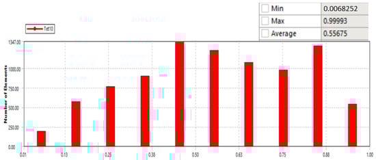 The Skewness standard was used in this study to determine the meshing feature. The findings revealed that the medium worth of this standard was around 0.55, as shown in Figure 12. Therefore, the achieved value guarantees an appropriate mesh for the developed positioner in the simulated process by FEA analysis.