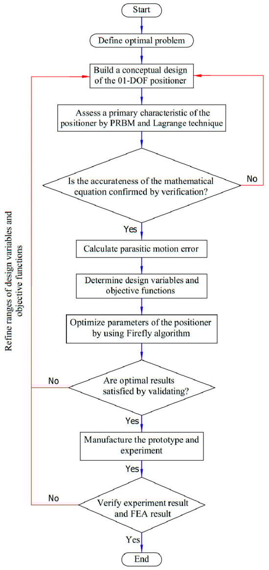 The design of the new positioner is based on a hybrid symmetric amplifier of the eight-lever mechanism, the Scott Russell mechanism, and a parallel mechanism for guiding the nanoindentation testing process. Firstly, the static–dynamic attributes of the proposed positioner were established using the pseudo-rigid-body methodology and the Lagrange technique to promptly evaluate the output response of the advanced Z-platform. Secondly, analytical models were verified by FEA analysis. Thirdly, according to mathematical equations, the Firely algorithm was used to optimize main design variables for enhancing the output attribute. Finally, the prototype was fabricated to verify the FEA result. More details about the conceptual framework flowchart of the proposed hybrid approach were demonstrated in Figure 14.