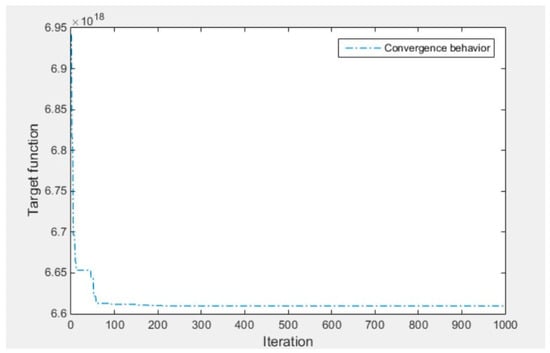 The incorporation method of the PRBM, the Lagrange technique, and the Firefly algorithm was developed using MATLAB 2021, as outlined in a series of Equations (1)–(39) and (41)–(43). The optimized design variables of the developed Z-platform were acquired as follows: T1 = 0.75 mm, T2 = 0.7 mm, T3 = 0.65 mm, T4 = 0.6 mm, D = 27 mm, and Y = 26 mm. The optimized outcome indicates that the optimized resonant frequency based on the analytical approach is approximately 220.16 Hz. Figure 15 illustrates the convergence behavior of the offered approach.