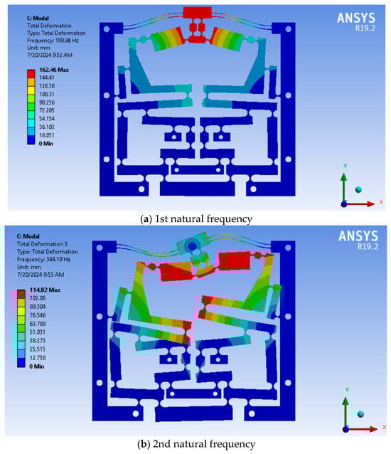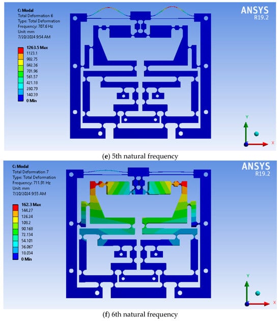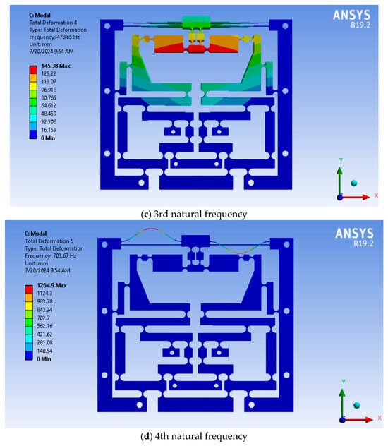 The optimized factors were utilized to create a 3D construction. According to the FEA result, the initial natural frequency is 198.86 Hz. Furthermore, the error between the optimum and FEA results for the 1st resonant frequency was 9.67%, as shown in Table 4. This outcome suggests that the approach framework described is reliable for forming the advanced positioner. Table 5 shows that, in contrast to the initial structure outcome, the frequency of the advanced positioner increased by 13.12%. Additionally, as depicted in Figure 16a–f, the natural frequencies for the six modes are 198.86 Hz, 344.19 Hz, 478.65 Hz, 703.67 Hz, 707.6 Hz, and 711.91 Hz, respectively. As a result, the resonant frequency values listed above, especially the 2nd natural frequency, as illustrated in Figure 16b, should be examined to prevent damage to the suggested positioner.