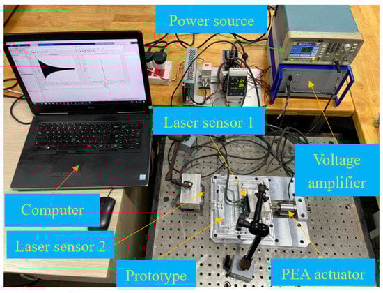 A prototype of the optimized positioner was produced to verify the output characteristic of the suggested structure. This research utilized a computerized numerical control milling technique to manufacture the optimized prototype. Figure 17 illustrates the constructed prototype and device configuration designed for evaluating the output response of the advanced positioner. The compliant positioner was actuated using the PEA (PI 225.10, PI, Karlsruhe, Germany), with a maximal working travel of 15 µm. The input and output displacements were quantified utilizing two laser displacement sensors, which possess a precision of 0.05 µm (LK-G30, Keyence, Osaka, Japan).