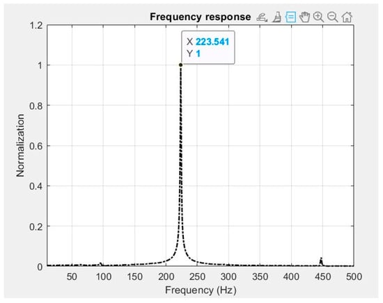 The advanced Z-platform’s initial resonant frequency was verified by the FEA frequency result of 198.86 Hz, which was obtained using Ansys software R19.2. The prototype’s high-quality surface was achieved by employing computer numerical control milling to manufacture the proposed design. The experimental natural frequency at the initial crest was 223.541 Hz, as illustrated in Figure 18. Table 6 indicates that the experimental findings and finite element analysis had a discrepancy of 11.04%. The obtained inaccuracy suggests that the Z-positioner’s measured natural frequency was close to the FEA outcome. The relationship diagram between input and output displacement based on the optimized and experimental results was illustrated in Figure 19. The achieved results were compared with the ref. [], as illustrated in Table 7. In addition, the output working stroke of the developed Z-positioner was compared with the previous studies, as illustrated in Table 8.