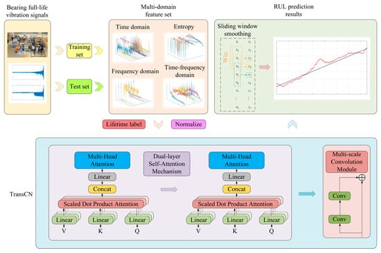 To accurately and reliably characterize the degradation trend of rolling bearings and predict their life cycle, this paper proposes a bearing life prediction model based on an improved transformer encoder layer and multi-scale convolution. First, time-domain, frequency-domain, and time-frequency domain features are extracted from the vibration data covering the entire lifespan of the rolling bearings and passed through the transformer encoder layer. A novel dual-layer self-attention mechanism network structure is proposed to capture global information on the lifecycle progression of rolling bearings. Next, to further extract local temporal features within the bearing’s life cycle, a multi-scale convolution module is proposed to reinforce the local information across the entire lifespan. This method fully exploits both the long-term trends and short-term dynamic variations in the health status of rolling bearings, effectively enhancing the accuracy of life predictions. Experimental results show that, even under conditions with interference features, the TransCN model outperforms mainstream advantage model in terms of prediction accuracy and generalizability. This approach offers a new solution for managing the fault risk of rotating machinery and reducing maintenance costs.
