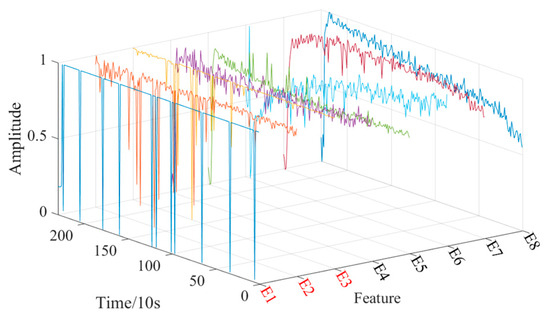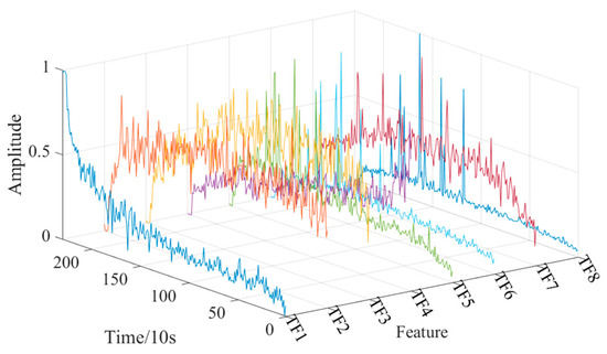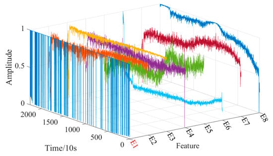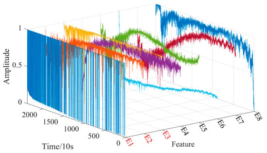 To further quantify the complexity of the running state of the bearing [25], eight entropy features are extracted based on the time domain, which are log energy entropy, Renyi entropy, Tsallis entropy, Shannon entropy, approximate entropy, fuzzy entropy, sample entropy, and permutation entropy, and are recorded as . The calculation formula is as follows: