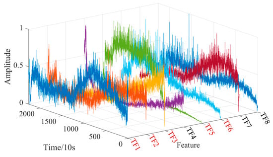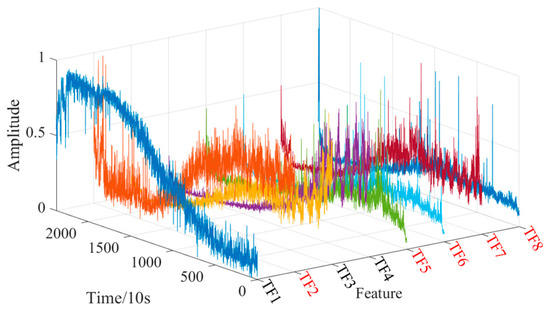 To further verify the generalization of the proposed model, under the same conditions, a feature of Bearing2_7 horizontal vibration signal in the time domain, frequency domain and time-frequency domain are extracted for network training. Bearing2_7 horizontal vibration signal and feature are shown in Figure 16, Figure 17, Figure 18, Figure 19 and Figure 20. It can be seen that most features show a certain overall growth or decline trend on the time axis, which is conducive to the life prediction of bearings, such as T2–T10, T17, T18, E4–E8, F1, F2, F4–F7, and TF1–TF4. At the same time, some features cannot reflect the degradation process of bearings (as shown in the red label in Figure 17, Figure 18, Figure 19 and Figure 20), such as T13–T16, E1–E3 and F3, there are very large fluctuations, T1, T11, T12 and T19 change steadily throughout the life stage, which does not help predict the degradation state of bearings. The bad features are input into the model as interference items for training, to verify the robustness of the model.