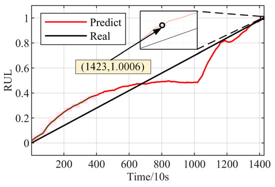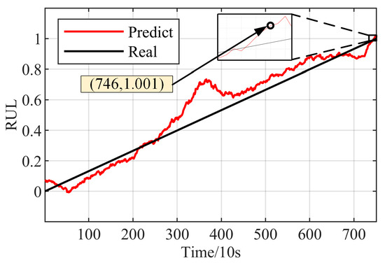 Bearing2_7’s multi-domain feature set is input into the network for training. After the network training is complete, Bearing2_4’s multi-domain feature set is input into the network to predict the bearing life. The network hyperparameter Settings are shown in Table 6. The life prediction results are smoothed, in this case, the window length is chosen to be 40, and the life prediction results are shown in Figure 21.