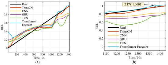 Experiment 1 comparison of multiple model prediction results: (a) comparison of the prediction results of the methods; (b) comparison results at the end of life.
