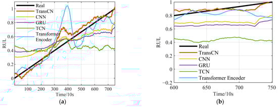 Experiment 2 comparison of multiple model prediction results: (a) comparison of the prediction results of the methods; (b) comparison results at the end of life.