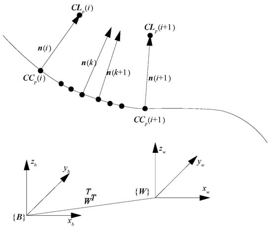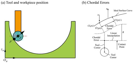 The position of the tool contact point in the workpiece coordinate system is represented by , and the normal vector is represented by , where R is the radius of the tool.