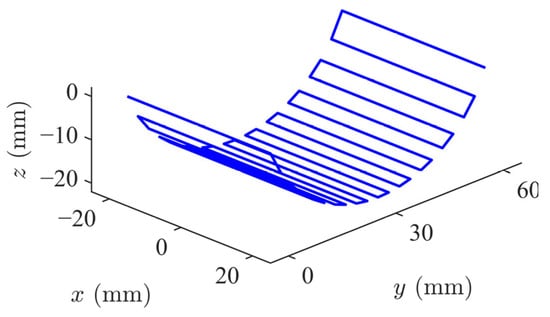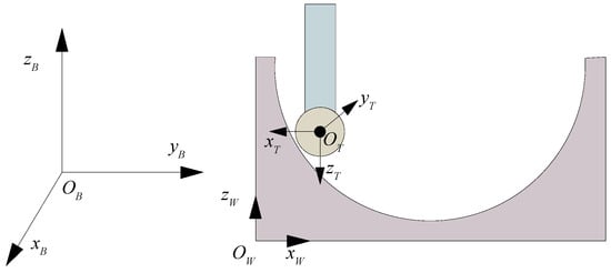 As shown in Figure 2, interaction of the polishing tool with the concave workpiece during machining is prevented by maintaining a constant orientation of the polishing tool coordinate {OT} with regard to the reference coordinate {OB}. Assume that in the base coordinates {OB}, the ZB-axis direction vector is [0 0 1]T. Simultaneously, in the tool coordinate {OT}, the ZT-axis direction vector is specified as [0 0 −1]T throughout the process. This specification implies that the rotation matrix R, which connects these two coordinate systems, remains constant. The constant rotation matrix R corresponds to specific Roll-Pitch-Yaw (RPY) angles that can be computed as . Similarly, the location of the origin of the tool coordinate system in the base corresponds to the position of the tool’s sphere center, represented by . The trajectory of the tool in Cartesian space throughout the process can be expressed as a 6 × 1 vector, composed of and :