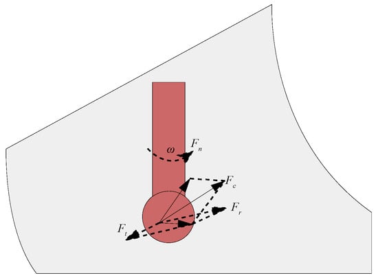 The force exerted by the polishing tool on the workpiece is denoted as Fc, which comprises three components: Ft, Fr, and Fn. Ft represents the frictional force acting opposite to the feed direction, Fn corresponds to the normal reaction force exerted by the surface perpendicular to the tool’s orientation, and F signifies the frictional force generated by the tool’s high-speed rotation: