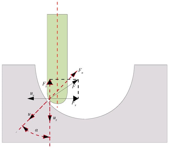 As shown in Figure 7, the system stiffnesses of the polishing system in both the horizontal and vertical directions are assumed to be kx and kz, respectively, the displacement compensation along the normal direction is u, the displacement deformations in the horizontal and vertical directions as well as the forces generated by the displacements are ux, kz, Fx, and Fz, respectively. The angle α represents the inclination between the surface normal and the tool axis, and the unit normal to surface vectors is n. The displacement compensation along the normal direction is u, and the forces generated by the displacements in the horizontal and vertical directions are n, respectively: