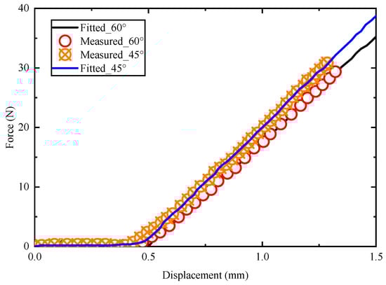 To accurately characterize the relationship between normal force and displacement, the tool axis was aligned vertically downward and computer-controlled to approach the workpiece along the surface normal at a constant slow rate. During each control cycle, the tool advanced by 0.05 mm; if the measured normal force exceeded 30 N, the tool was retracted. To assess the influence of the angle α on system stiffness, tests were performed at 45° and 60° using a spherical rubber polishing tool. Figure 8 presents the force–displacement curves, where a normal force of zero denotes no contact. Curve fitting yields effective stiffness values of ke = 37.366 N/mm at α = 45° and 35.149 N/mm at α = 60°, indicating that the system’s normal stiffness varies with α.