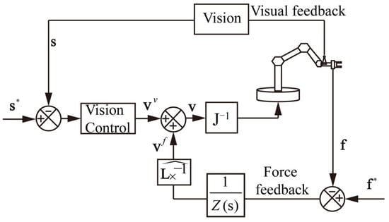 As depicted in Figure 10, the resultant control vector within the vision-force impedance control system is formulated as , where the kinematic screw is derived from the vision control law, and the force control loop determines . By focusing solely on the stiffness matrix within the impedance control law and employing a standard visual servo methodology, the formulation for the impedance vision-force control can be articulated as follows [42,43]: