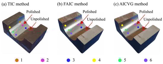 The efficacy of the three control methods was further verified through surface quality evaluation. As illustrated in Figure 22, a comparative visualization of the workpiece surface before and after polishing reveals substantial improvement in smoothness. The workpiece was divided into polished and unpolished sections along its axis, with six measurement points (different color) selected from the polished region to assess surface roughness. The average value of these measurements was subsequently calculated.